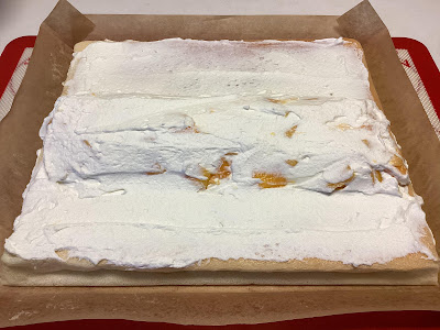 - Remove the parchment paper from the cake and spread on a thin layer of whipped cream.